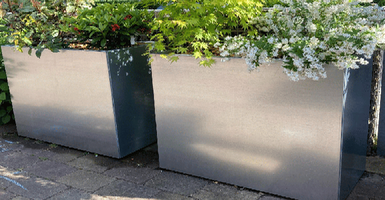 Големите саксии са налични в различни материали, всеки с уникални характеристики и естетическа привлекателност. Саксиите от корозийна стомана са например устойчиви на атмосферни условия и придават индустриален щрих на градината с ръждивия си вид. Прахово боядисаните стоманени саксии са налични в различни RAL цветове, предоставяйки цветни покрития и възможности за персонализация. Освен това те са защитени от атмосферни влияния. Те добре се вписват в съвременна и изчистена градина.