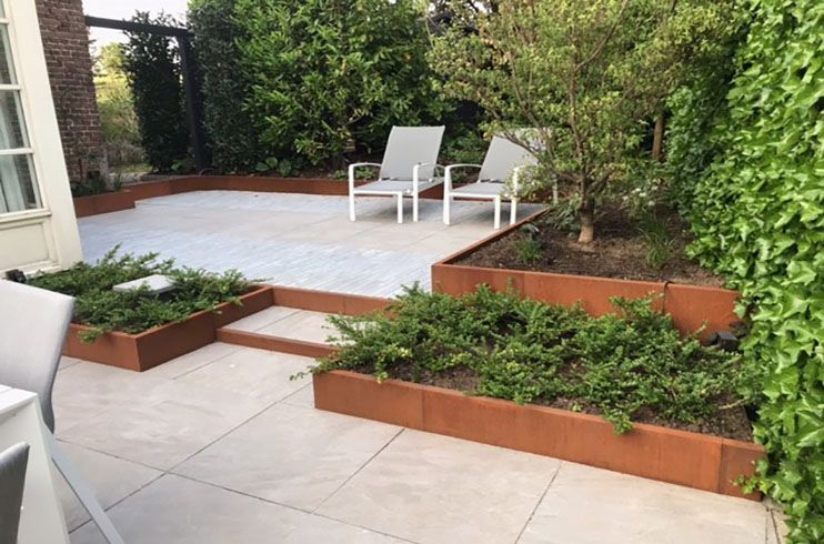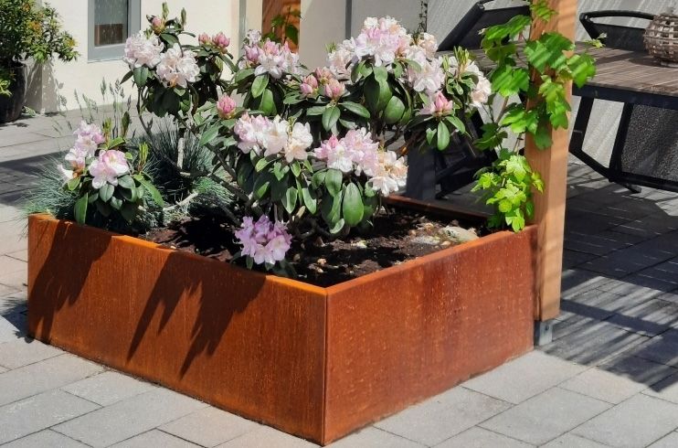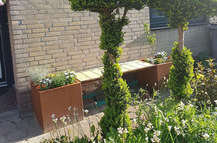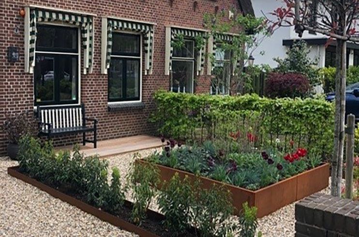 С кортенова стомана можете също да направите силно визуално изявление в предната си градина. Един начин да интегрирате кортенова стомана във вашата предна градина е да поставите саксия от кортенова стомана и да придадете зелено акцент на предната си градина. Освен това можете да добавите номер на къщата или пощенска кутия от кортенова стомана, за да направите цялостно решение. Или комбинирайте саксиите с пейка между тях за приятно място за сядане пред вашия дом. Предимство на кортеновата стомана в предната градина е, че тя е без поддръжка; това означава, че можете да се насладите повече на градината си, вместо да работите по нея.