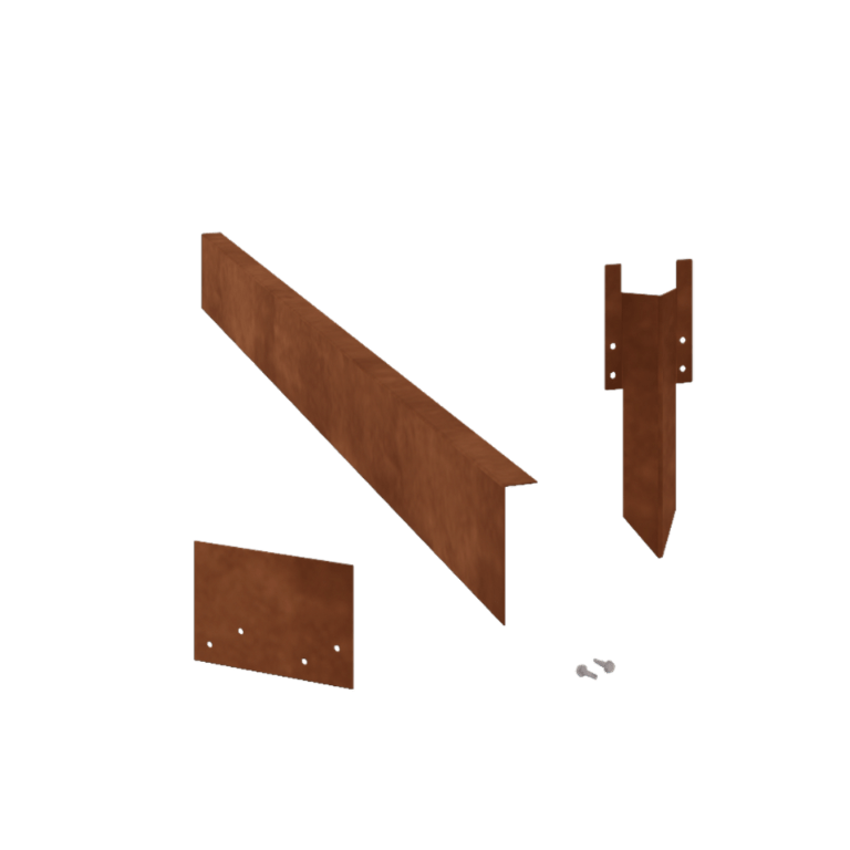 Материал Тези бордюри са изработени от висококачествена стомана Corten-A. Този вид метал има уникалното свойство да образува много плътен оксиден слой (ръждясал слой). Преминаването на ръжда е невъзможно. Поради плътния оксиден слой, по-дълбокият материал е защитен от кислород, което значително забавя окисляването, докато корозията продължава. Бордюрът се доставя неръждясал, в сив метален цвят. Процесът на ръждясване започва през първите 2 месеца, за което не е необходимо лечение. По време на процеса на ръждясване бордюрът може да оставя следи. Corten стоманата е метална сплав, която се състои от желязо, към която са добавени мед, фосфор, силиций, никел и хром.