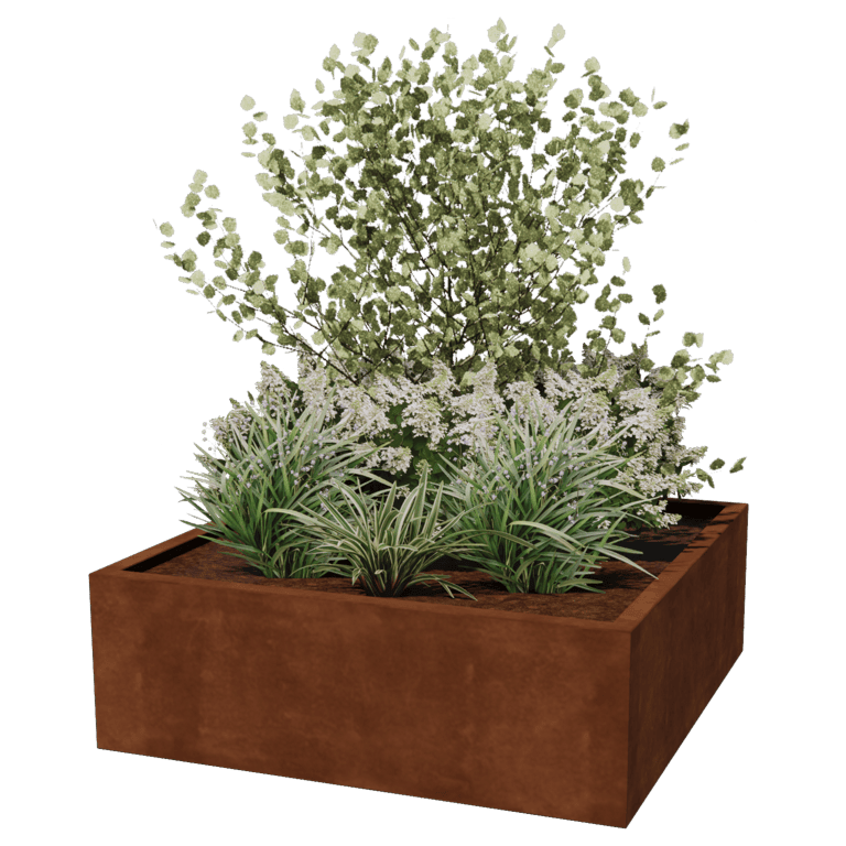 Тези саксии се произвеждат от висококачествена корозионно устойчива стомана. Този вид метал има уникалното свойство да образува много плътен оксиден слой (ръжда) и поради това е невъзможно да ръждясва. Плътният оксиден слой предпазва по-дълбокия материал от кислород, което значително забавя окисляването, докато корозията продължава. Заварената саксия от корозионно устойчива стомана се доставя неокислена, в сив метален цвят. Процесът на ръждясване започва в първите 2 месеца, за което не е необходимо лечение. По време на процеса на ръждясване саксията може да оставя следи. Корозионно устойчивата стомана е метална сплав, която се състои от желязо, към която са добавени мед, фосфор, силиций, никел и хром.