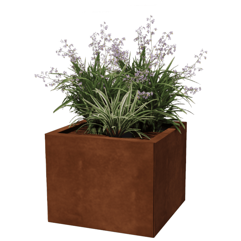 Панелите на нашите модулни саксии се произвеждат от висококачествена Corten-A стоманена плоча. Този вид метал има уникалното свойство да образува много плътна оксидна повърхност (ръждясал слой) и е невъзможно да ръждясва. Плътната оксидна повърхност защитава по-дълбокия материал от кислород, което значително забавя окисляването, докато корозията продължава. Саксията от кортенова стомана се доставя неокислена, в сив метален цвят. Процесът на ръждясване започва след седмици до 2 месеца, за което не е необходимо никакво третиране. По време на процеса на ръждясване саксията може да оставя следи. Corten стомана е метална сплав, която се състои от желязо, на което са добавени мед, фосфор, силиций, никел и хром.