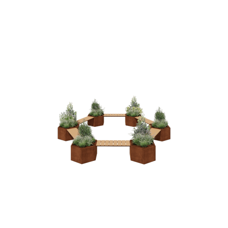 Саксии за цветя от кортенова стомана - Разположение тип лагерен огън - 502,2 x 459,2 x 50 cm - C пейка - без основа