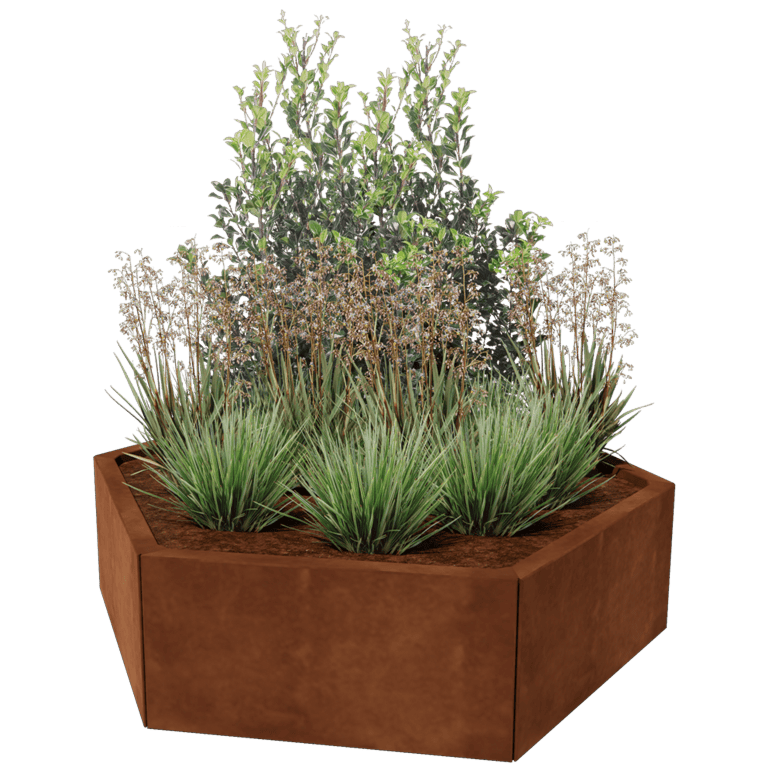 Тази саксия е модулна стоманена саксия, която се предлага като комплект за сглобяване. Саксията се изгражда от отделни панели и ъглови елементи. Саксиите могат да се свързват напълно без видими закрепвания. Благодарение на нашата модулна система, са възможни и много големи размери. Чрез използването на ъглови елементи, могат да се създават уникални форми, които не могат да бъдат намерени стандартно никъде другаде.