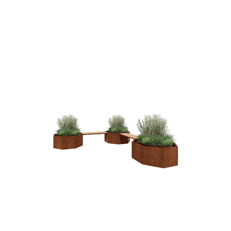 Саксии за цветя от кортенова стомана - Осмоъгълник - Ъглова подредба - 362,6 x 120,7 x 50 cm - C пейка - без основа
